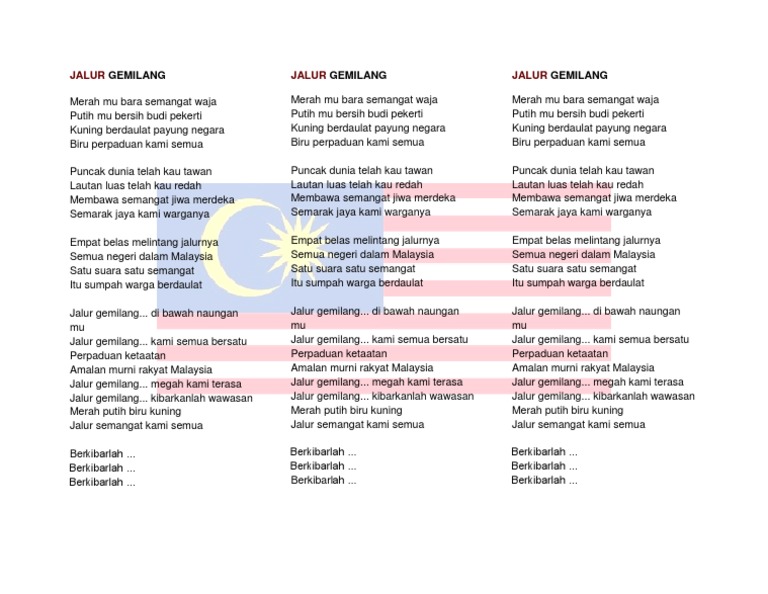 Lirik lagu jalur gemilang merahmu bara semangat waja putihmu bersih budi pekerti kuning berdaulat payung negara biru perpaduan kami semua puncak dunia telah kau tawan lautan luas telah kau redah membawa semangat jiwa merdeka semarak jaya kami warganya empat belas melintang jalurnya semua negeri dalam malaysia satu suara satu semangat itu sumpah. Putihmu bersih budi pekerti. Demi bangsa kedaulatan negara.